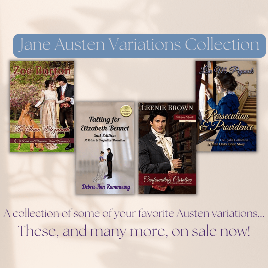 | The best news of all for you readers, are the promos that I am running this month! First, I am taking part of the Jane Austen Variations Collection promo on Bookfunnel. Follow the link to view the selection! There are also books from Zoe Burton and Leenie Brown, among others. This promo runs all month long! Undone Business and Matching Pemberley are usually $2.99 and No Cause to Repine is usually $7.99. |